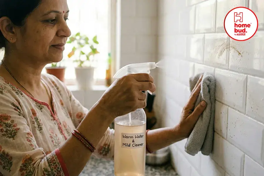 You don’t need harsh chemicals. A mix of warm water and mild liquid cleaner works perfectly for most kitchen tiles. Spray lightly and let it sit for a minute.